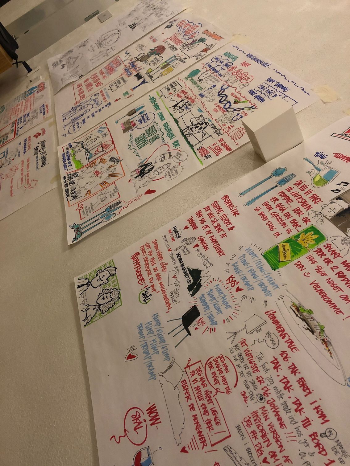 en tegneserie af en mand, der står foran en hvid tavle med tegninger på.